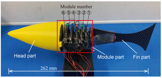 Figure 14 shows the fish robot fabricated based on the design policy. The fish robot was fabricated by connecting the designed six-drive modules and connecting the head and tail fin parts at the front and rear. The head part and the upper and lower base frame parts of the drive modules were made of Poly-Lactic Acid (PLA) resin using 3D printing. The fin part was made from a thin Carbon Fiber-Reinforced Plastic (CFRP) plate and plastic pieces. A vinyl sheet was applied from both sides of the modules to the tail fin to reduce the fluid resistance of the modules.