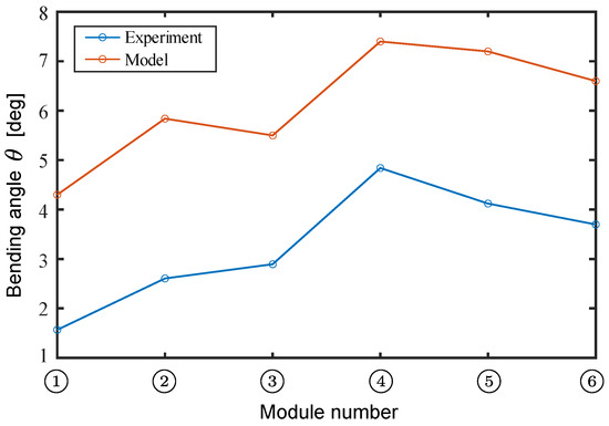 The maximum bending angle of 4.84 deg was recorded by Module ➃ in the experiment. The correlation coefficient with the model calculation results using Equation (29) is , indicating that the calculated trend of the bending angle by the model reproduced the trend of the actual module with high accuracy.