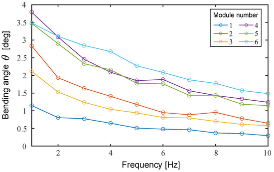 Next, we verified the frequency response characteristics of the bending angle. The left and right oblique cone DEAs were actuated using a 1 Hz to 10 Hz sinusoidal voltage, ranging from 0 kV to 6 kV, with a phase difference of rad. As shown in Figure 16, the bending angles of Modules ➃ and ➅ are reversed at a frequency of lower than 2 Hz. The smaller rate of decrease in the bending angle of Module ➅ is inferred due to the relatively large blocking torque. Therefore, the amount of blocking torque is considered crucial in the high-frequency band.