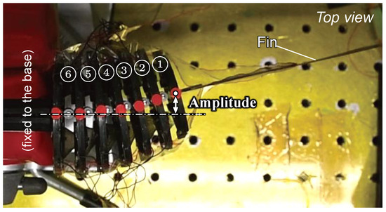 Figure 18 shows the experimental results of the relationship between the frequency of the applied voltage and the amplitude of the swing of Module ➀. Figure 18a clearly shows that the amplitude increase rate increases monotonically from Module ➅ to ➀, promising the formation of a smooth swimming shape that is less susceptible to fluid resistance. As shown in Figure 18b, the amplitude decreased gradually between 2 Hz and 4 Hz. The maximum amplitude of 6.05 mm was recorded at 2 Hz, excluding the very slow drive frequency of 0.2 Hz. These results indicate a resonant frequency near 2 Hz, attributed to module connections. The limited frequency response of the modules likely causes the sharp amplitude decline above 4 Hz.