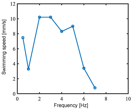 Experimental results of swimming speed at varying driving frequencies.