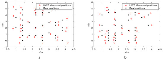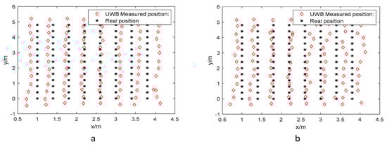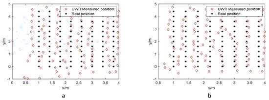 Actual coordinate positions and UWB measurements in NLOS environment: (a) 0.45 m and (b) 0.15 m.