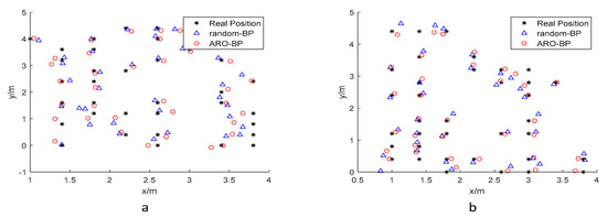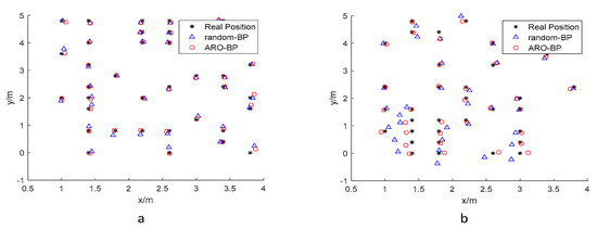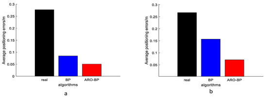 From the experimental results, the average error of the data used for testing in the NLOS environment at a height of 0.45 m is 35.91 cm. The average error of the BP model is 20.81 cm, and that of the ARO-BP model is 12.78 cm, which is obviously better than the BP model, and the accuracy of the newly proposed model is 22.45% higher than that of the traditional BP model. The average error of the data used for the test is 25.93 cm at a height of 0.15 m. The average error of the BP model is 16.38 cm, while the average error of the ARO-BP model is 9.01 cm, which is obviously better than the BP model, and the accuracy of the ARO-BP model is 28.43% higher than that of traditional BP model.