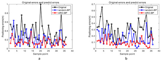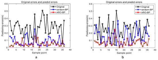 For model evaluation, randomly selected test points were processed through both BPNN and ARO-BP architectures to generate predicted positions. Figure 7 compares the actual coordinates (black asterisks) with predictions from the baseline BPNN (blue triangles) and optimized ARO-BP (red circles), with all coordinates expressed in meters.