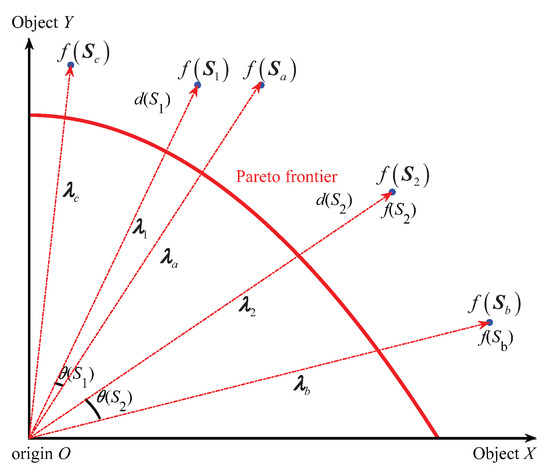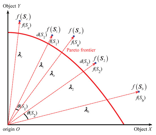 Figure 2, the two solid line coordinate axes represent two optimization objectives,