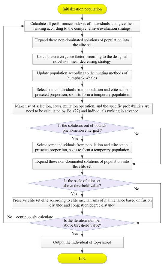 First of all, using angular penalty distance (APD) as an evaluation index can effectively and dynamically balance the importance of the convergence distribution during the evolution process so as to effectively improve the global optimization ability of the IWOA-APD. Second, an exponential non-linear decreasing strategy is adopted. By selecting the most appropriate optimization factor , the non-linear recursion can be optimized and adjusted. Utilizing the decreasing trend of the reduction function further enhances the global optimization ability of the IWOA-APD. Finally, by combining the fusion distance and the crowding distance, an elite set is constructed. Therefore, this optimization algorithm has a stronger ability to maintain population diversity, and it is possible to improve the global convergence ability of the IWOA-APD.
