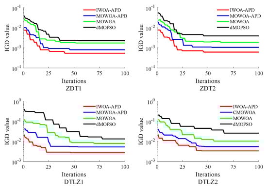 35] series of two objectives benchmark functions were used as multi-objective optimization objects. To verify the effectiveness of the IWOA-APD, the ZDT1, ZDT2, DTLZ1, and DTLZ2 benchmark functions were optimized by IWOA-APD, MOWOA-APD, MOWOA, and dMOPSO under the same conditions based on the above simulation verification platform, and the optimization results were compared and analyzed. The specific optimization simulation results using four benchmark functions are shown in