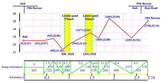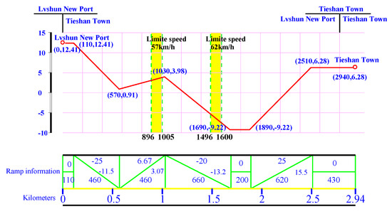 Figure 11, the x-axis represents cumulative travel distance (km), and the y-axis represents relative elevation (m). For example, the elevation at the “Lvshun New Port” station is 12.41 m, and at the “Tieshan Town” station, it is 6.28 m. The red line shows the elevation changes at each mileage point, where (a, b) represents the mileage (a, in meters) and relative elevation (b, in meters). Yellow vertical bars indicate speed limit sections, with bold text displaying the speed limits (km/h). The green line represents the ramp information, and the blue numbers show the slope, elevation change, and ramp length (in meters). Slope information is crucial for traction control and energy optimization.