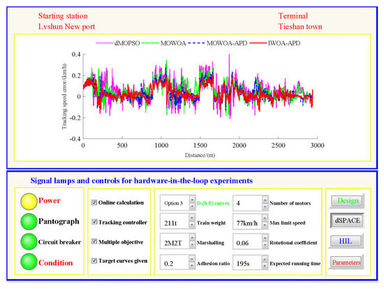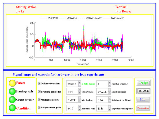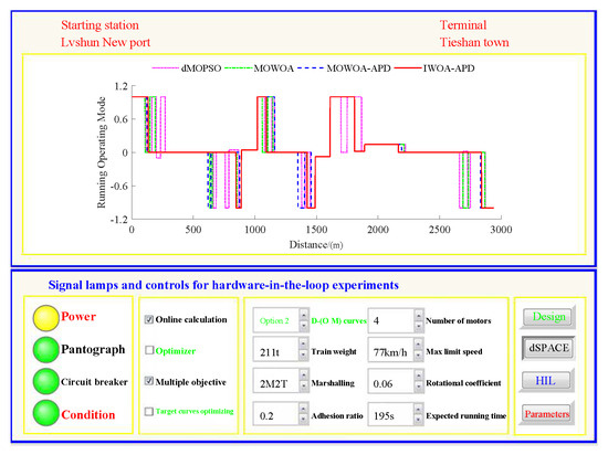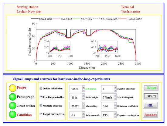 Table 10, it can be seen that under the same HIL experimental environment of train target speed curve optimization, IWOA-APD has significantly better global optimization performance; compared with the multi-objective optimization algorithms MOWOA-APD, MOWOA, and dMOPSO used for comparative verification, it obtained significantly better performance index optimization results (energy saving, punctuality, comfort level, and parking accuracy were all improved to a considerable extent), and IWOA-APD requires less computation time on the premise of obtaining significantly better performance index optimization results. From