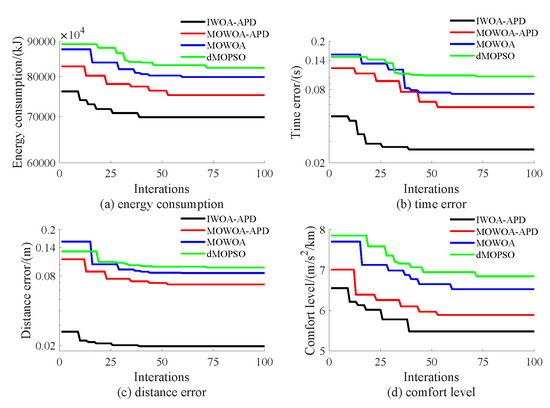 Figure 19, compared with IWOA-APD, traditional optimization methods (MOWOA and dMOPSO) and the improved optimization method (MOWOA-APD) do not have enough global optimization performance. To make sure that sufficiently small time and parking errors are obtained, it has to settle for the second best, so more complex ATO processes with several unnecessary operation sections are forced to be accepted and energy consumption and comfort level are also increased. It can be reflected from