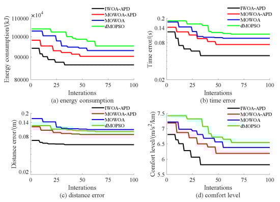 Table 12, it can be seen that under the same HIL experimental environment of the target speed curve tracking control, IWOA-APD obtains the target velocity curve that is easier to track control. Compared with the multi-objective optimization algorithms MOWOA-APD, MOWOA, and dMOPSO used for comparative verification, it obtains significantly better performance index tracking control results (energy saving, punctuality, comfort level, and parking accuracy are all improved to a considerable extent). It can be seen from