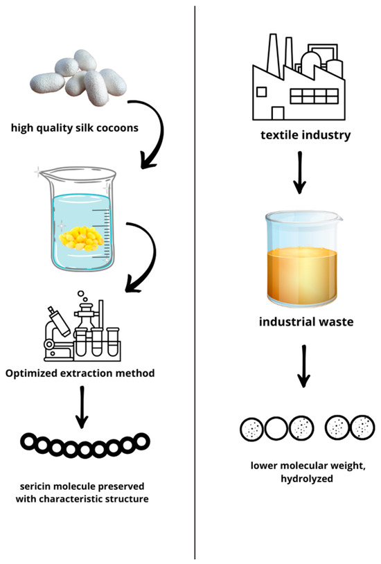 Pure sericin with a high molecular weight obtained by an optimized extraction protocol vs. waste-recovered sericin with a lower molecular weight and contaminants.
