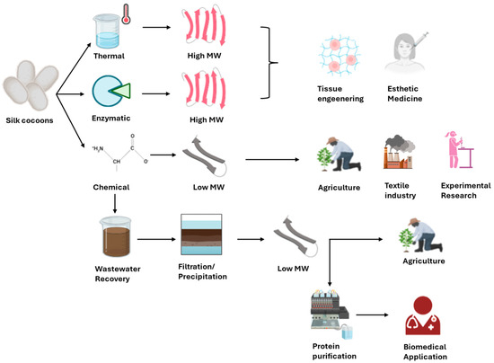 The comparative analysis of the extraction methods is necessary to guide researchers and industry professionals in choosing the most appropriate approach based on technical and practical requirements. Given the wide range of available techniques, the selection of a suitable degumming method must consider the intended application of the final product. While high-purity sericin is essential for medical and cosmetic applications, less pure forms may be acceptable in agriculture or textile finishing (Figure 2).