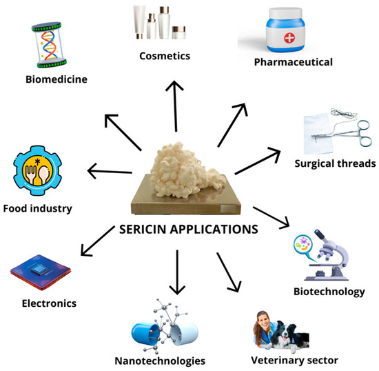 - Kunz, R.I.; Brancalhão, R.M.; Ribeiro, L.F.; Natali, M.R. Silkworm Sericin: Properties and Biomedical Applications. Biomed. Res. Int. 2016, 2016, 8175701. [Google Scholar] [CrossRef] [PubMed]