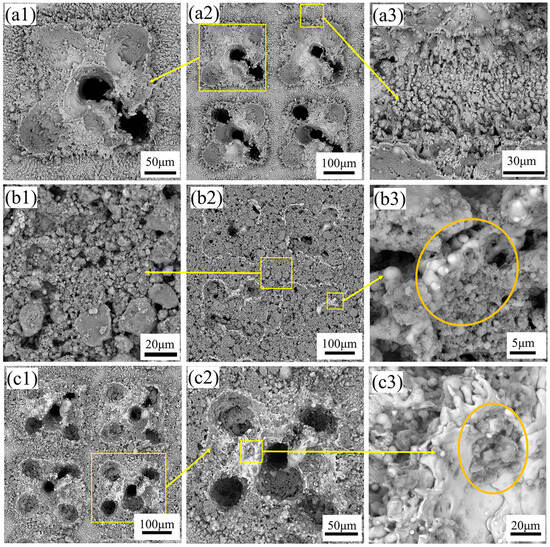 As shown in Figure 2(a1,a2), SEM observations reveal that the surface of the titanium alloy after laser etching is characterized by the presence of five small circular pits. The circular pits are formed by the rapid melting and vaporization of the material by the high energy density of the laser beam. The laser scanning speed is relatively fast without overlapping the adjacent laser beams, resulting in such discontinuous circular pits. However, there are obvious sputtered micron-sized particle bulges around the square pits, as shown in Figure 2(a3). This is due to the rapid cooling and solidification of the splashed liquid metal during the melting and vaporization process when the laser beam acts on the surface of the titanium alloy. Therefore, the micro-scale surface structure was formed on the surface of the titanium alloy by laser etching.