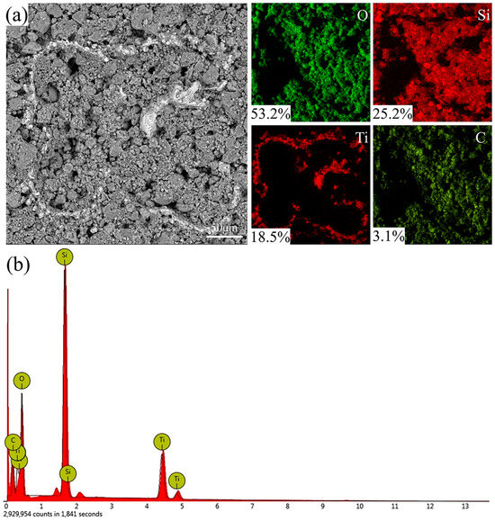 EDS analysis was performed on the surface of the coated specimen, as shown in Figure 3a and Figure 4b. The surface of the coating is mainly composed of O, Si, Ti, and C elements. In Figure 4a, the most distributed element is O, accounting for 53.2%, followed by Si, Ti, and C. Because SiO2, PDMS, and EP in the coating contain a large number of oxygen elements, and laser etching leads to the oxidation of the titanium alloy surface, the distribution of the O element is the most. The Si element mainly comes from PDMS and SiO2, which are evenly distributed on the surface. At the same time, the Ti element is only distributed in the exposed part, because the EDS element analysis detects shallow surface elements by exciting element characteristic X-ray. The C element is mainly provided by PDMS and EP, and is also evenly distributed on the surface. As shown in Figure 4b, the energy spectrum results of elemental analysis on the sample surface are shown. Therefore, PDMS and EP play an essential role in the coating, adhering to SiO2 particles and reducing the surface energy, to improve the superhydrophobic performance of the surface with the micro–nano composite structure.