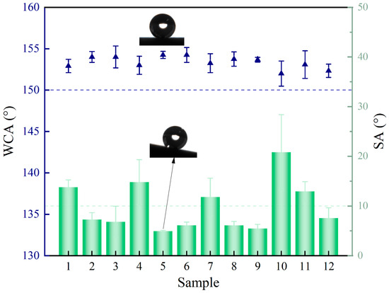 By testing the WCA and SA of different samples, the data presented in Figure 5 were obtained. During the experiments, the ambient temperature was approximately 26 °C, and the water droplet volume was around 2 μL. It can be clearly observed that the WCA of all coated samples exceeds 150°, meeting the criterion for superhydrophobicity. However, only Samples 2, 3, 5, 6, 8, 9, and 12 exhibit an SA below 10°. A comprehensive evaluation of surface wettability based on both WCA and SA confirms that only these seven samples can be classified as superhydrophobic surfaces. Separately, the static CAs of all samples are close to 153°, and the difference between them is slight. The results show that the prepared coating has good water repellency, and PDMS, EP, and SiO2 play an essential role in the coating. The combination of PDMS and EP provides low surface energy and adhesion properties for the coating. SiO2 particles act as micro/nanostructures on the surface of the titanium alloy, which makes the droplets maintain the Cassie–Baxter state on the surface.
