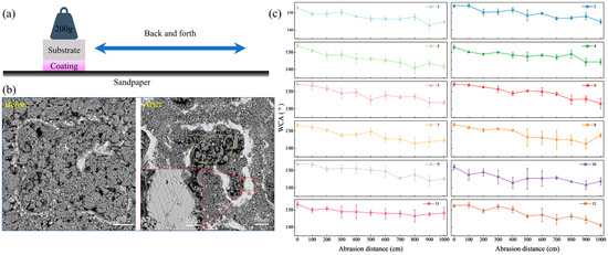 Due to the particularity of the surface, the abrasion of superhydrophobic coatings often leads to a decline or even loss of hydrophobic properties. When evaluating the overall performance of the coating, mechanical stability is as important as the superhydrophobic function. To investigate the influence of abrasion on the surface hydrophobic coating, the WCA was measured after the sample underwent abrasion on sandpaper over different distances under the weight of the sample, as shown in Figure 6a. The applied weight during the test was 200 g, and the abrasive material was 1200 cw silicon carbide (SiC) sandpaper. The sample was dragged slowly at an average speed during the test, with a total abrasion distance of 1000 cm.