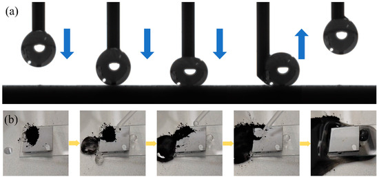 The surface adhesion is characterized by the degree of adhesion of the droplets on the surface. The droplets are extruded through the needle tube, and the droplets remain on the needle through intermolecular cohesion and electrostatic adsorption. Then, the needle tube is lowered to make the droplets contact the surface, and finally, the needle tube is lifted to observe the adhesion effect of the droplets on the surface in this process. As shown in Figure 8a, when the droplet contacts the surface, it remains highly spherical. After the droplet is wholly separated from the surface, no droplet residue is observed, so there is almost no adhesion on the prepared coating surface. The self-cleaning effect is usually used to simulate the removal effect of rainwater or water flow on pollutants in the natural environment, and it is an essential means to test the surface functionality. During the test, the sample is tilted at a certain angle, carbon black powder is dispersed on the surface of the sample, and then the drip tube is used to drip water on the surface to make the water droplets roll or flow on the surface. The carrying and removal degree of carbon black powder by water is observed. As shown in Figure 8b, the carbon black powder on the surface of the sample is almost entirely carried away by the droplets, which indicates that the sample surface has good self-cleaning characteristics. Therefore, the prepared superhydrophobic coating on the titanium alloy substrate can not only maintain high WCA and low adhesion, but also enable water droplets to carry and quickly remove the attached pollution particles when rolling on the surface, showing excellent self-cleaning and decontamination ability. This ability can not only effectively reduce the dependence on manual cleaning and chemical reagents, but also significantly improve the service life and maintenance efficiency of equipment surfaces in harsh application environments such as aviation, aerospace, and marine engineering, which is of great significance to achieve emission reduction and consumption reduction and improve the reliability of use.