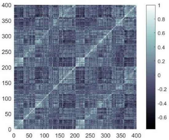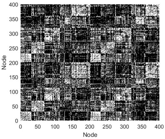 In this study, the quantity of network nodes is 400, thus the is 11.98. In Table 1, when is below 0.6, the network density varies in [3.6% 39.3%] and the mean node degree exceeds 11.98, which are most consistent with the features of the FBN in humans. In addition, when = 0.2, the SD values are smallest. Hence, the value of was taken as 0.2 in this study, and the edge links of the FBN for subject 12255 were obtained, as presented in Figure 3.