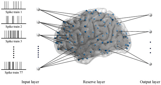 From Figure 7, the input layer is populated by the Izhikevich neuron models to process preprocessed spike trains. Critically, the quantity of neurons in this layer is dynamically adapted to match the quantity of frequency bands obtained from multiscale decomposition of speech signals. The reserve layer, implemented as an SNN, constructed as described above, exhibits complex nonlinear dynamics. The output layer is populated by Izhikevich neuron models, with the population size determined by the quantity of target speech categories. The synaptic connections between these two layers are optimized through remote supervised learning (ReSuMe) by minimizing the difference between the actual firing sequence and the desired firing sequence, an efficient training algorithm specifically designed for SNN.