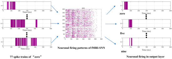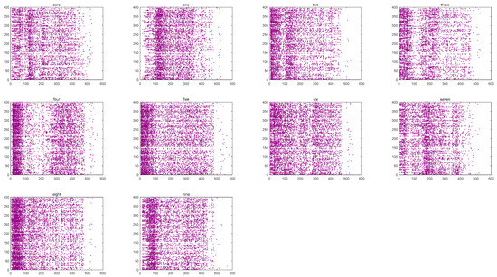 Once the input layer receives the spike trains, they are passed to the reserve layer as input currents, causing changes in neural activity. Figure 9 illustrates the firing patterns of the fMRI-SNN over 600 ms, triggered by distinct speech signals (“zero” to “nine”).