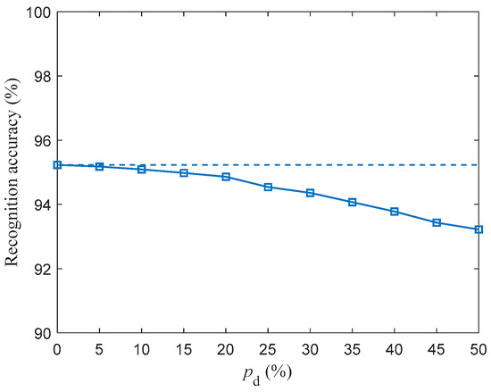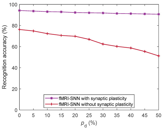 Brain-like neuromorphic hardware is commonly used for pattern recognition tasks, and has demonstrated a strong performance in speech recognition, image classification, and obstacle avoidance. Wu et al. [1] implemented a spiking neural network (SNN) with dynamic memristor-based time-surface neurons on complementary metal–oxide semiconductor (CMOS) hardware network architecture, and applied it in a speech recognition task on the Heidelberg digits dataset. They found that the speech recognition accuracy of this SNN hardware is 95.91%. Han et al. [2] implemented SNN on Field-Programmable Gate Arrays (FPGA), and applied it in a handwritten digits classification task on the MNIST dataset. They found that the classification accuracy of this SNN hardware is 97.06%, and the power consumption is only 0.477 W. However, electromagnetic interference can damage the components of electronic equipment, resulting in a decline or even failure of their normal function [3]. As a product of natural selection, the human brain is adaptive to exterior attack [4]. Thus, a brain-like model, by incorporating self-adaptability, could be expected to improve its robustness; however, existing models are limited by their lack of bio-plausibility. As a brain-like model, the SNN contains neuron models, synaptic plasticity models, and topology, which offers a powerful processing capability for temporal-related signals through simulating electrophysiological properties [5].