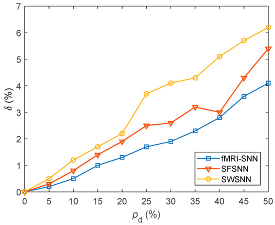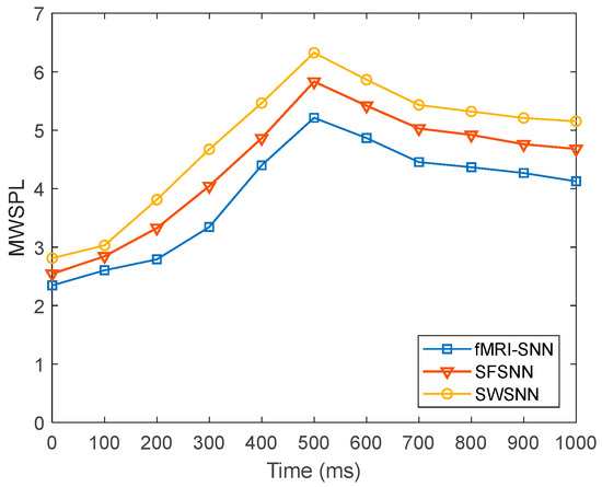 Figure 23 shows that when is 25%, the fMRI-SNN exhibits significantly lower values compared to both SWSNN and SFSNN, implying superior global transfer of information efficiency for our fMRI-SNN.