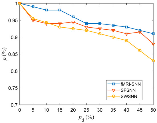 Figure 21 shows that when is 25%, the fMRI-SNN exhibits significantly higher values compared to both SWSNN and SFSNN, implying superior local efficiency of information transfer efficiency for our fMRI-SNN.