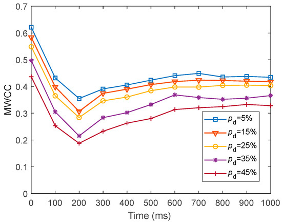 To present the global efficiency of information transfer in fMRI-SNN against stochastic attack, we presented the dynamics of for fMRI-SNN against stochastic attack with distinct values of within 1000 ms, as presented in Figure 22.