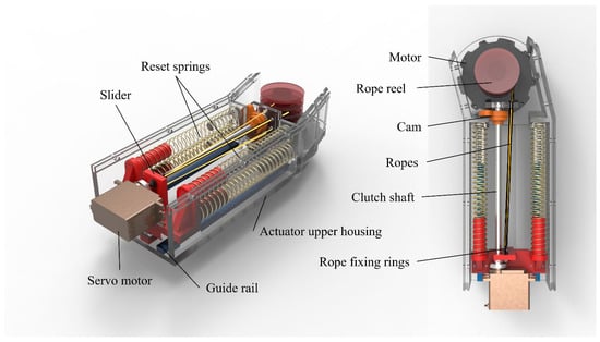 Inspired by the mechanism, we designed an actuator that uses fiber ropes to simulate muscle fibers and imitates the effect of muscle recruitment by pulling a combination of rope bundles of different sizes. The schematic diagram of the actuator is shown in Figure 2, which consists of a 3D print housing, a motor, four reset springs, a slider, two sets of guide rails, a rope reel, a clutch including a servo motor, a cam, a clutch shaft, and ropes, etc. When the motor is running, its rotation is transferred to the rope reel, which separates each rope at a certain distance and drags all the ropes. The ropes undergo elastic–plastic deformation and transmit power, thereby providing linear displacement. When the slider is driven in a linear direction by the ropes, it compresses the four integrated reset springs nested inside the slider. When the motor reverses direction and the rope bundle relaxes, the elastic restoring force of the springs drives the slider back to its initial position, effectively completing the retraction process.