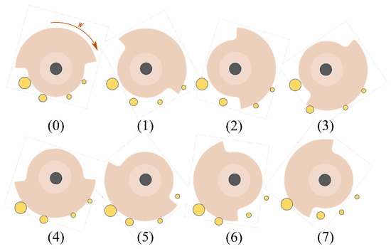 The clutch realizes the bionic muscle unit by controlling the number of ropes connected, thereby achieving rapid switching of the overall stiffness. More specifically, the rotation of the cam driven by the servo motor enables sequential engagement of multiple locking positions, thereby completing the locking action of the fiber ropes tied to the slider. Theoretically, this type of clutch enables switching between multiple rope bundle configurations. Owing to its fan-shaped layout, the number of achievable configurations increases proportionally with the number of ropes. Considering the stiffness resolution required by the knee exoskeleton and the need to balance performance with structural complexity, this study adopts a clutch configuration with four ropes, enabling seven combinations. While increasing the number of ropes would allow for finer stiffness modulation, it would also increase the size and complexity of the clutch mechanism, making it less suitable for integration into compact wearable systems. Given that the target motion scenarios—including walking, running, stair ascent, and ramp ascent—do not demand extremely high stiffness resolution, the current configuration was selected as an optimal compromise between functional sufficiency and mechanical simplicity. Through the schematic diagram of the clutch switching principle in Figure 3, the clutch activation process of multiple groups of rope bundles can be seen more clearly.