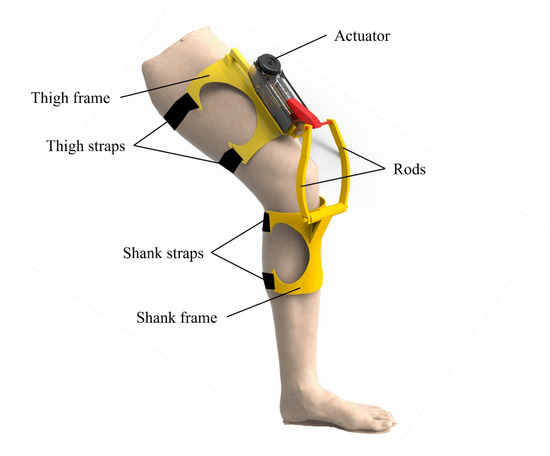 Based on the concept of adaptive stiffness inspired by human muscle behavior, we have designed a bionic knee exoskeleton using a rope-driven artificial muscle actuator. The schematic diagram of the knee exoskeleton is demonstrated in Figure 4. The exoskeleton is mainly composed of an actuator, thigh frame, shank frame, and rods. When the actuator applies linear motion, the rods transmit power to the shank frame, providing joint torque for the knee exoskeleton.