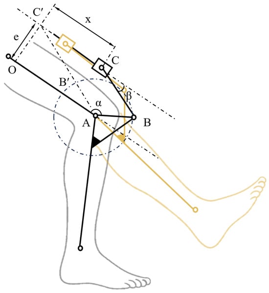 where represents the distance from O to C’, represents the distance from A to O, and the others are defined similarly. As shown in Figure 5, let angle be the rotation angle of point B on the crank AB, and let angle be the angle between the connecting rod BC and the motion trajectory of the slider C.