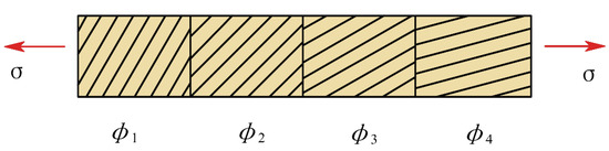 Northolt et al. [26] used the onset of a sequential and plastic orientation mechanism of the chains brought about by the resolved shear stress to explain the yield phenomenon of composite fibers on the tensile curve. Under tensile conditions, the fiber is considered to be composed of parallel rows of identical fibrils that are uniformly stressed along the fiber axis. Each fibril consists of a series of rectangular domains connected end to end, as shown in Figure 7.