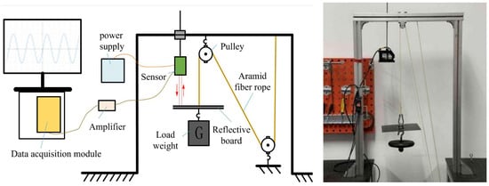 The experimental setup is shown in Figure 9. The IL300 laser displacement sensor was used in conjunction with the IL1000 sensor amplifier to accurately measure the deformation of the aramid fiber rope at each moment (Keyence, Osaka, Japan). The PCI-1716 data acquisition card and LabView were used for data acquisition and export. After completing the calibration, the experiment was started.