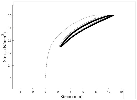 The aramid fiber rope serves as the primary load-bearing element in our actuation system. Its strength and durability are crucial to the stability and safety of the equipment, and also have a profound impact on the application potential of this research in clinical and industrial fields. In order to verify the stability of the mechanical properties of aramid fiber ropes during cyclic loading, a 500-cycle simulation was performed with a single cycle period of 2 s. The stress–strain cycling curve of aramid fiber rope with 2.5 mm diameter is shown in Figure 10.
