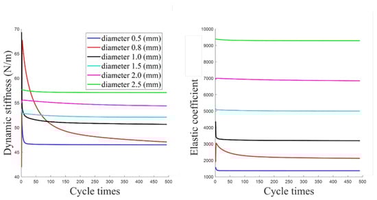 Transforming Equation (42) into Equation (43), the Mk/l can be the elastic coefficient. The dynamic stiffness and elastic coefficient results of aramid fiber ropes with six different diameters are shown in Figure 11.