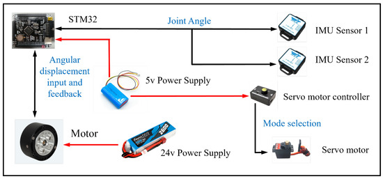 The mechatronics diagram of the knee exoskeleton is shown in Figure 12, where the black lines represent information transmission and the red lines represent power supply. We use stm32 as the control board of the knee exoskeleton to process sensor information and control the motor. Two inertial measurement unit (IMU) sensors are placed flat on the shank frame and thigh frame to realize gait recognition. The drive mode of the actuator is adjusted through the servo motor controller to achieve power output with different stiffness. Walking, running, or stair ascent each triggers a corresponding rope bundle configuration based on predefined settings to achieve stiffness adjustment.
