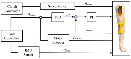 A control schematic diagram of the knee exoskeleton is shown in Figure 13. When the exoskeleton is operating, it provides assistance to the knee joint during extension according to the joint angle required for gait. The clutch controller controls the servo to change the θservo to achieve different stiffness requirements under different movement modes or walking speeds. The gait controller controls the motor to the corresponding angular displacement according to the gait information, and makes real-time adjustments based on the feedback from the motor encoder.