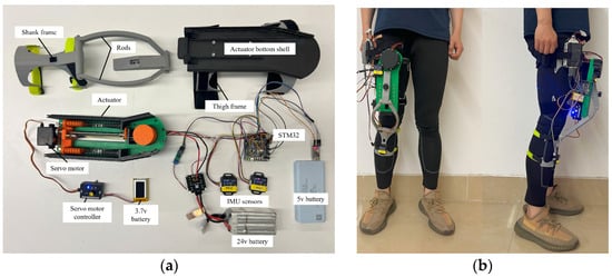 The exoskeleton prototype: (a) exoskeleton system components; (b) wearing diagram of the knee exoskeleton prototype.