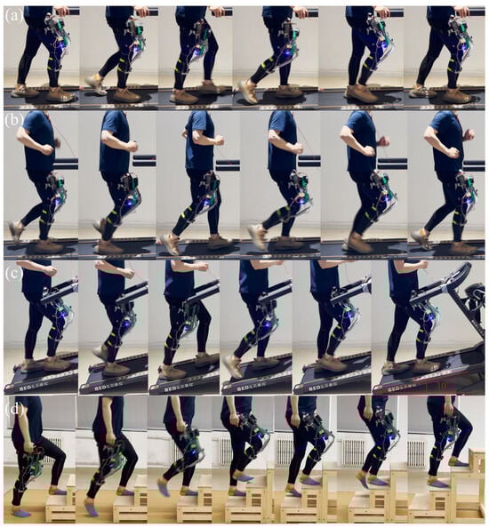 As shown in Figure 15, the exoskeleton wearable experiment mainly tested four modes: walking, running, climbing uphill, and climbing stairs. For different modes, the clutch control drive system outputs power with different stiffness. The joint kinematics are presented through frame-by-frame extraction from the recorded video, and the observed motion trajectories are used to visually verify the synchronization and responsiveness of the exoskeleton joint motion with the user’s motion.