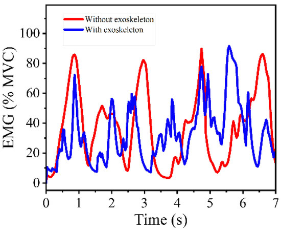During experimental testing, when walking at 1 m/s and 1.5 m/s, all participants reported that the drive mode with a single 0.5 mm aramid rope had the best compliance and wearing comfort. When running at 2.5 m/s and 3.5 m/s, participants of lower weight preferred the rope combination of 0.5 mm/0.5 mm, while participants of larger weight preferred the rope combination of 0.5 mm/0.5 mm/1 mm. In both the 1 m/s uphill climbing condition and upstairs climbing, all participants preferred the stiffer rope combination. According to the above performance, the following conclusions were drawn regarding the performance of different rope groups in different modes for different body types. When walking at low speed, a low-stiffness drive will bring better compliance and comfort. When running, the human body moves fast, and the joints need higher stiffness to maintain the stability of the body. The actuator should output power with higher stiffness. When climbing upstairs and walking uphill, the human body moves slowly but needs to overcome more gravitational potential energy to do work. High-stiffness power transmission reduces transmission delays and is conducive to body posture stability. In addition, we conducted an EMG experiment to compare muscle activation levels during walking with and without the knee exoskeleton. A lightweight, single-channel surface EMG sensor was placed on the rectus femoris to monitor muscle activity. As shown in Figure 16, the value of maximum voluntary contraction (MVC) over several gait cycles shows that muscle activation in the rectus femoris was reduced when the exoskeleton was worn, indicating that the system provides partial assistance to the knee joint and contributes to load sharing. The instability of EMG signals with exoskeleton may be caused by skin sweating or sensor compression. The latest Mechanomyography (MMG) technology is expected to improve this problem [35].