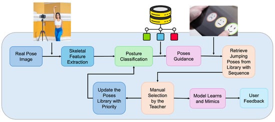 As illustrated in Figure 1, the process begins with the capture of a real-time image of the model using a camera. The input image is processed using a skeleton detection framework (e.g., MediaPipe Pose), and keypoint features such as joint coordinates, angles, limb symmetry, and body proportions are extracted. These features are then input into a trained classifier (e.g., Transformer or LSTM-based model) to determine the posture category among five fundamental actions: standing, sitting, jumping, lying, and crouching. Once the pose is classified, the system retrieves a set of relevant reference poses from a pre-tagged posture library. These reference images are organized by category and annotated with quality indicators such as symmetry score or expressiveness rating. The retrieved images are displayed through a visual interface, where the teacher can swipe through and manually select the most suitable example for demonstration.