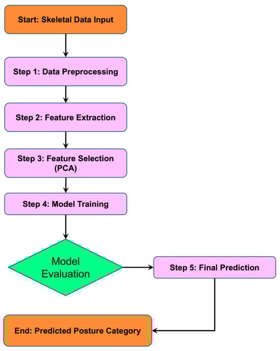 This section presents the algorithmic framework for skeleton-based human posture recognition and classification. The complete workflow is described in Algorithm 1, and the main stages are also visualized in Figure 3.