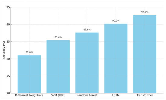 Figure 5 shows the training time for each model using the updated dataset. As expected, Transformer and LSTM models required longer training durations—approximately 135 and 60 s, respectively—compared to less than 15 s for all traditional models. While deep learning offers superior accuracy, these results highlight the need to balance accuracy with training cost based on application requirements.