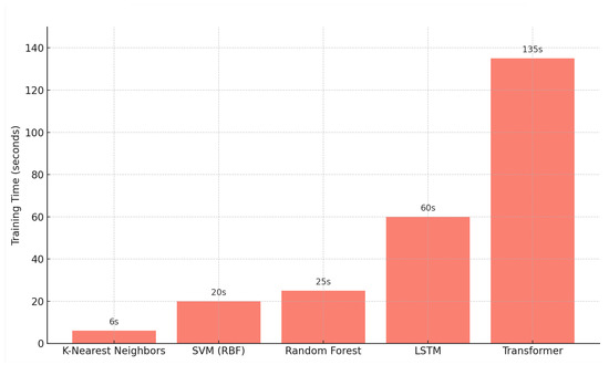 The training time analysis in Figure 5 highlights this trade-off clearly. While Transformer provides the best metrics, its cost is also the highest. KNN and Random Forest took less than 30 s to train, while LSTM and Transformer ranged from 70 to 135 s. All models were trained on a desktop workstation with Intel i7 CPU, 32GB RAM, and an NVIDIA RTX 3060 GPU. To speed up training, we applied early stopping and PCA to reduce dimensionality before model fitting.