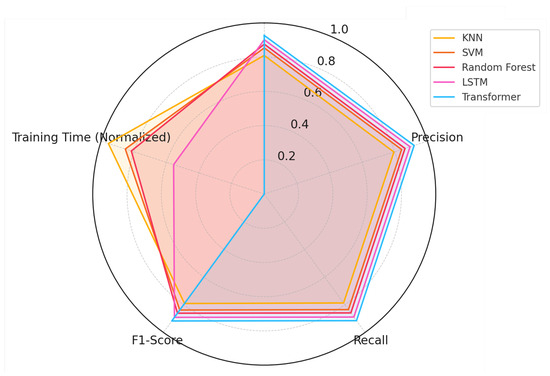 Radar Chart of Performance Comparison Across Accuracy, Precision, Recall, F1-score, and Normalized Training Time.