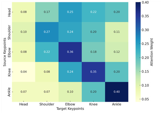 In addition to evaluating overall performance, the use of attention visualization provided deeper insights into how the Transformer model makes classification decisions. Figure 7 illustrates the attention weights between different skeletal keypoints, revealing which keypoints receive the most focus during classification. The attention heatmap shows that certain relationships, such as those between the shoulder and elbow, consistently receive high attention. This suggests that upper limb coordination plays a critical role in posture recognition. Similarly, the attention weight between the knee and ankle highlights the importance of lower limb alignment in distinguishing postures like crouching and jumping.