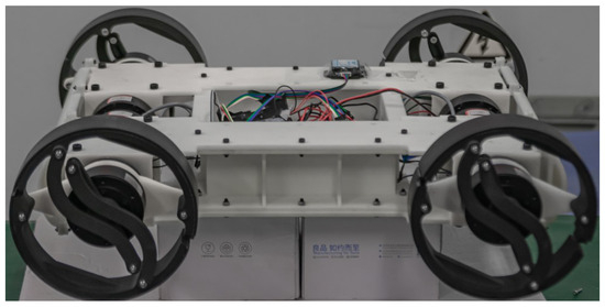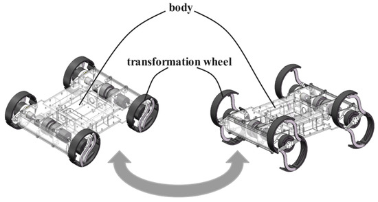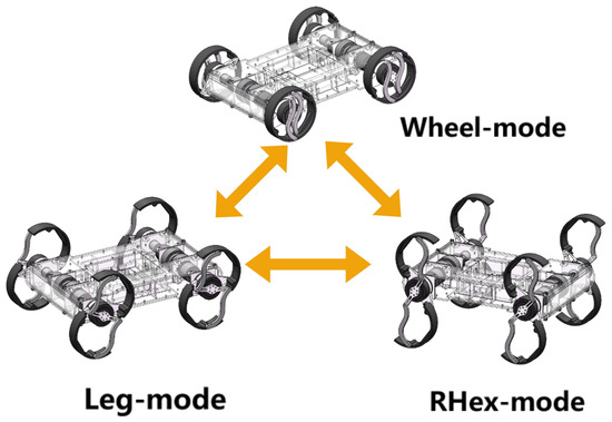 As illustrated in Figure 1, the robot features a square chassis (580 × 490 × 180 mm) with four 2-DOF transformable limbs arranged in bilateral symmetry. The quasi-hollow structure reduces weight while accommodating control electronics, achieving a 10.6 kg total mass through optimized material distribution. The six-bar linkage leg mechanism achieves seamless transition between circular (wheeled) and semicircular (legged) configurations through coordinated motor control, enabling the robot’s dual-mode locomotion capability as shown in Figure 2. Dual-motor architecture decouples locomotion and transformation functions (see Section 2.2). Conductive slip rings prevent cable entanglement during continuous rotation.
